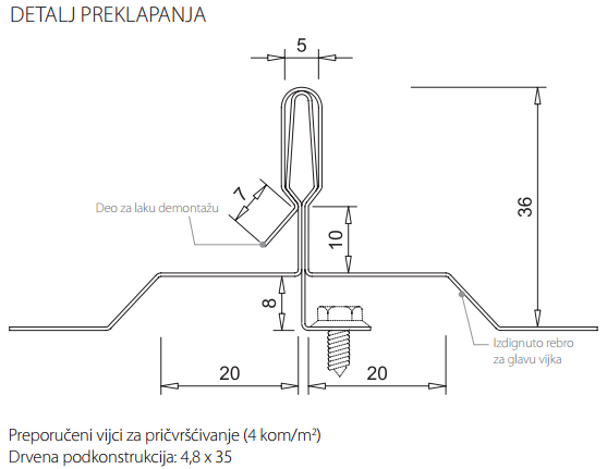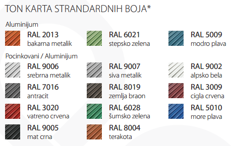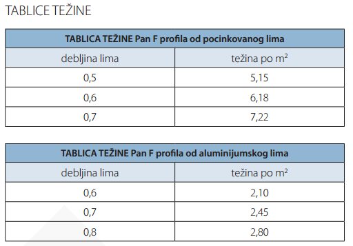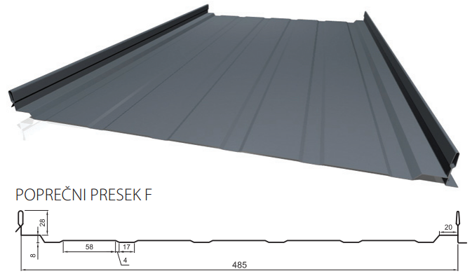 Corrugated sheet from F series through roofing mimics the classic elements used for "flat" roofing. This samouklapajući cover plate can be used for roofs, walls and ceilings, and covering it much easier and faster than conventional falcovanih elements. Pan F raised its profile rib seamlessly covers the mounting screws so that they are not exposed to weather conditions. It also has a unique profile of the edge of the ribs which facilitates the eventual dismantling. This product can be made of galvanized sheet and aluminum sheet.