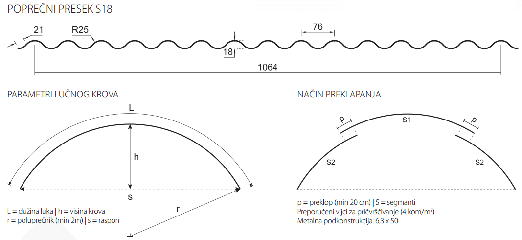Pan LS18 arc sine is corrugated sheet metal used as a structural element of the hangar. Except as roof can be built as an curved wall element silos with exceptional carrying capacity. Delivered bent to the required radius of the site without the required subsequent treatment. This product can be made of galvanized sheet and aluminum sheet.